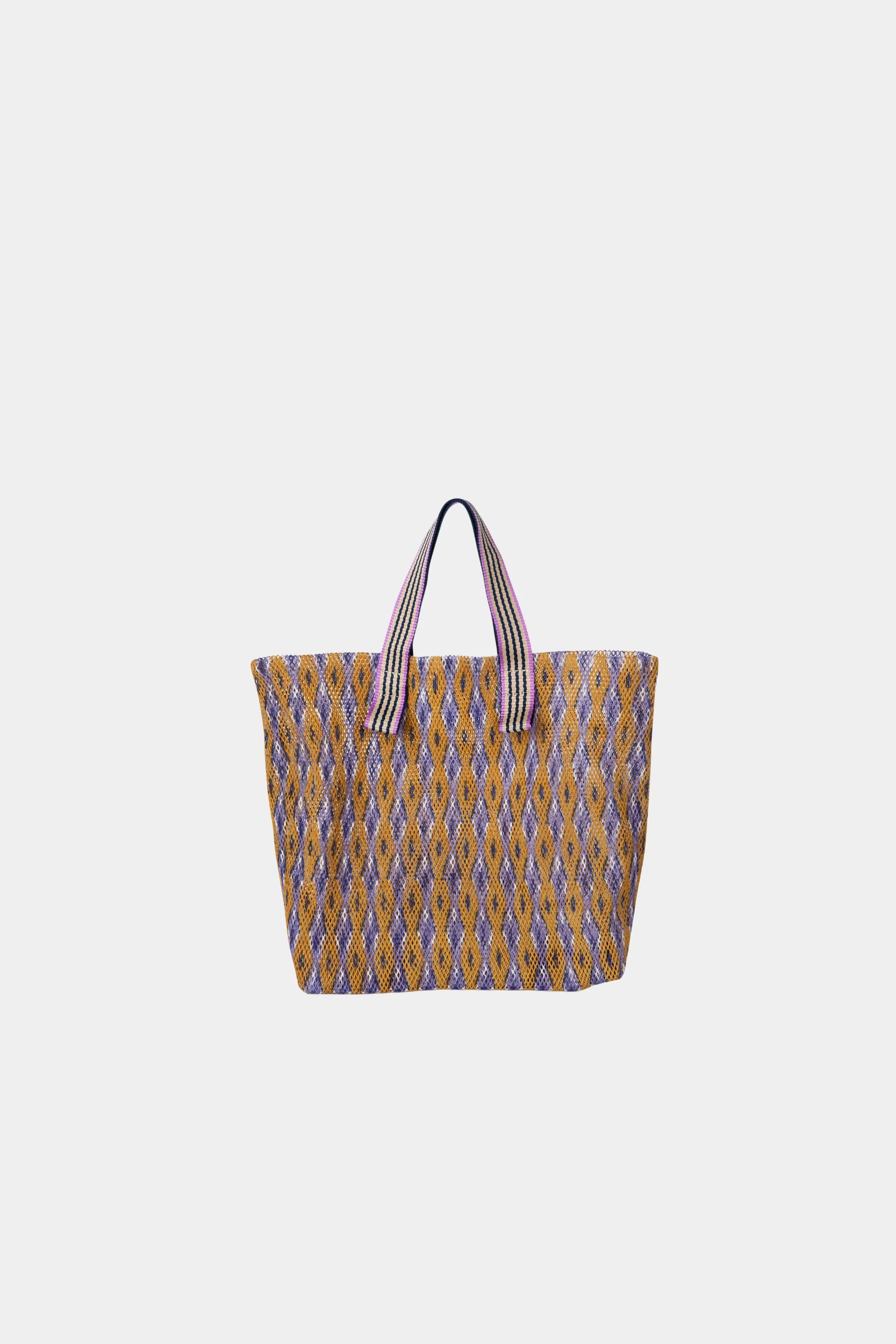 Bolsa de malla, doble espesor, forma tote. Nuevo diseño X, creado a partir de un bloque de impresión de madera vintage, luego diseñado con nuestras combinaciones de colores. Derivado de nuestras estolas PS 2551-54. Detalle refinado de las asas tejidas de doble cara, decoradas con un patrón diferente en cada lado. Bolsillo interior extraíble con cremallera. Bolso elegante, ligero y práctico para el día a día, para llevar en la mano o al hombro. Ideal para acompañar nuestras estolas. Impresión digital.