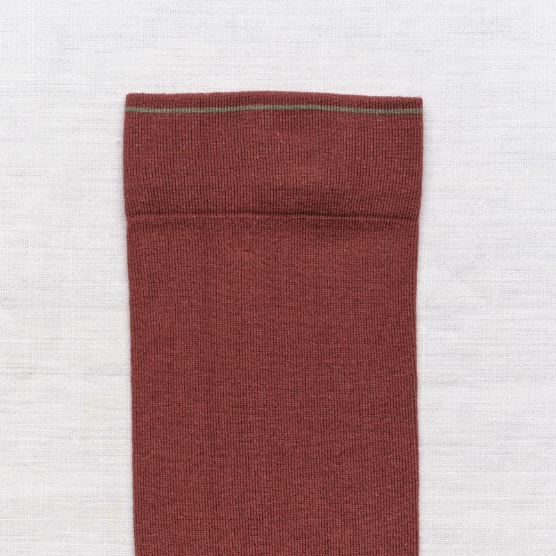 Calcetines lisos color burdeos antiguo con puntera y borde en verde cedro.La marca francesa Bonne Maison crea calcetines de alta calidad con algodón egipcio y doble hilo de elastano.
