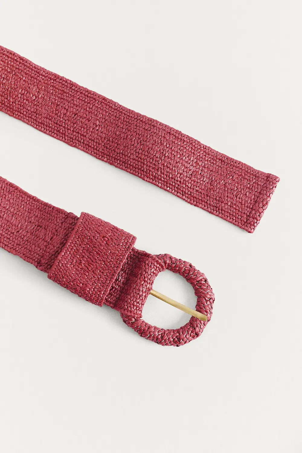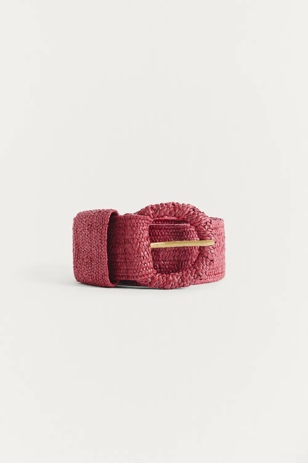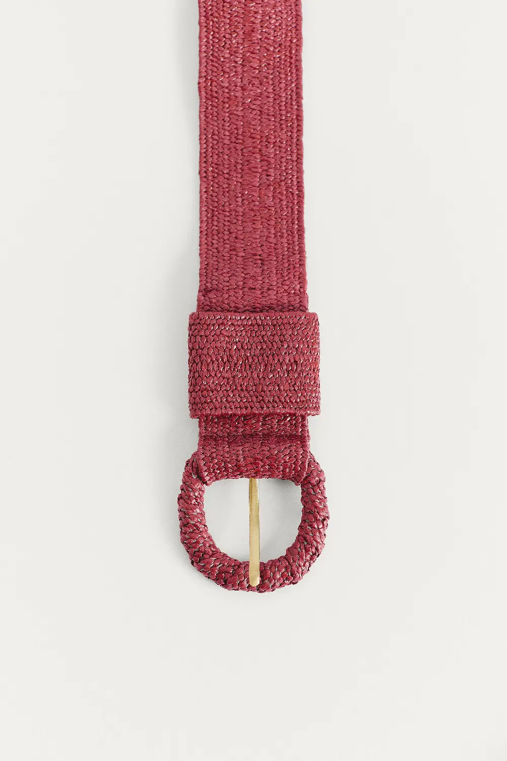 Cinturón ancho elástico de rafia en color cereza. Hebilla a tono. Medidas: 5 cm x 90 cm.