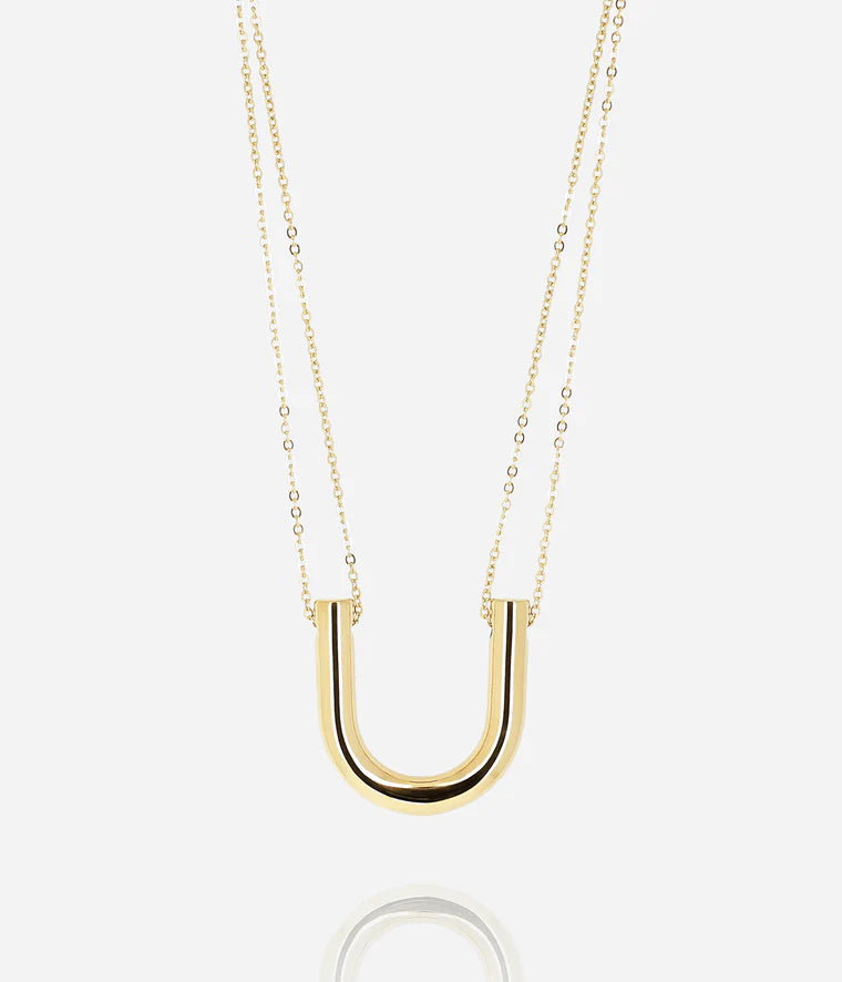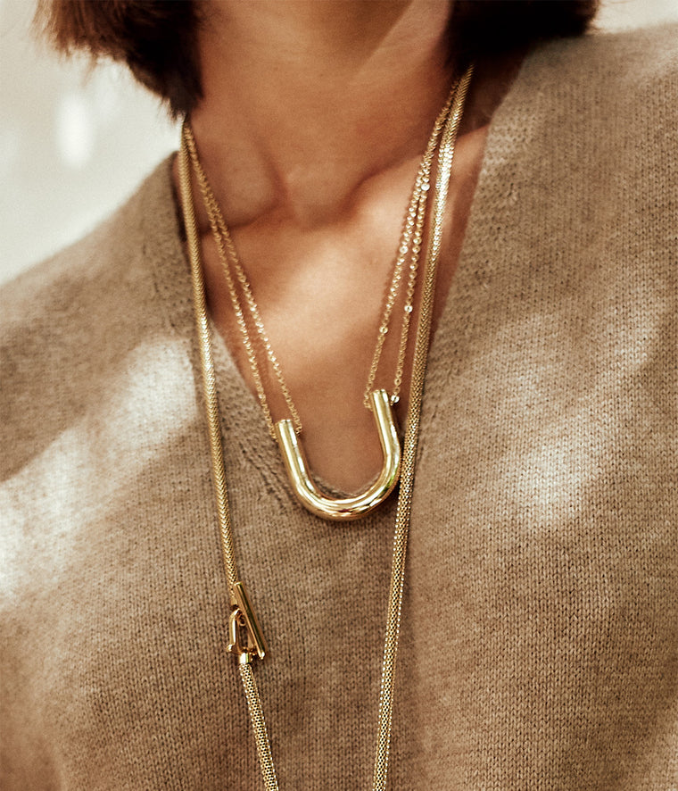 Collar de múltiples filas en acero liso o dorado, engastado con un colgante en forma de U.