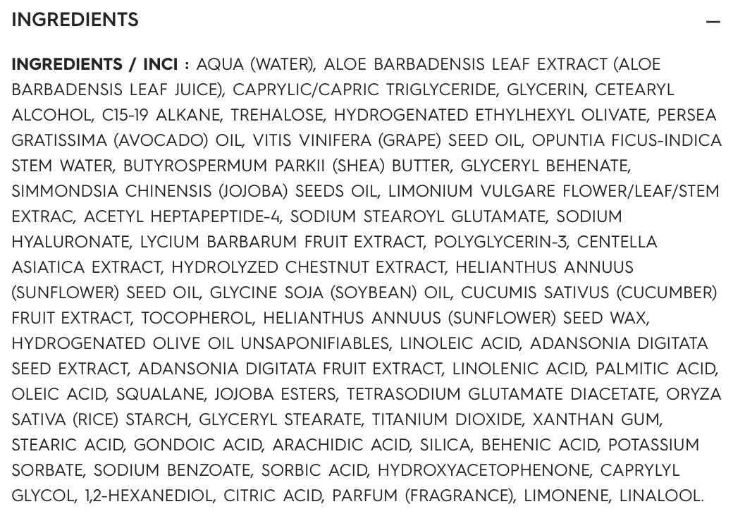 Hidratante + Hidratante + Antiarrugas + Suavizante + Restaura la flexibilidad + Protege la barrera cutánea + Previene la pérdida de agua: Ácido hialurónico, trehalosa natural, escualano vegetal, aloe vera orgánico, glicerina, vitamina F, manteca de karité orgánica, aceite de aguacate, aceite de jojoba, extracto de goji, lavanda marina, centella asiática, aceite de baobab orgánico.