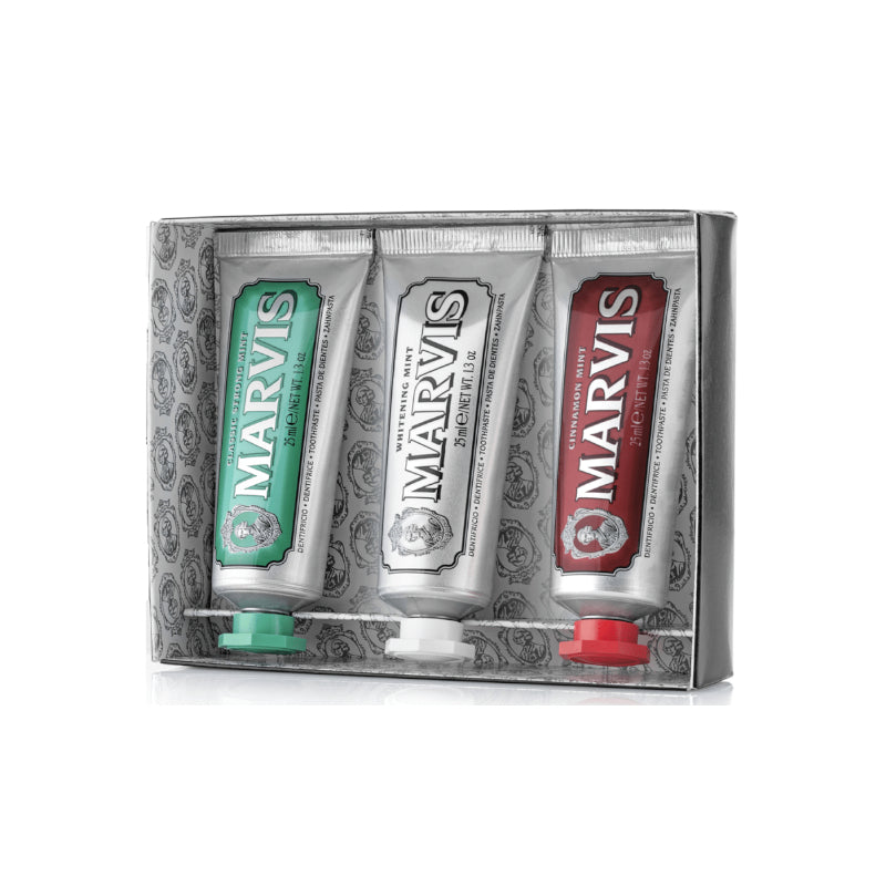 Marvis Estuche 3 Sabores x 25 Ml. ¡El pack perfecto para llevar de viaje contigo! Es cómodo, sencillo y práctico para poder realizar una higiene bucal perfecta y mantener una sonrisa bonita y brillante.