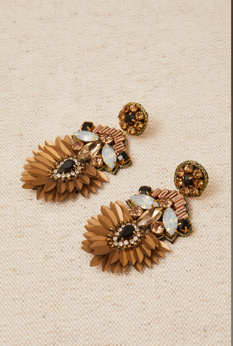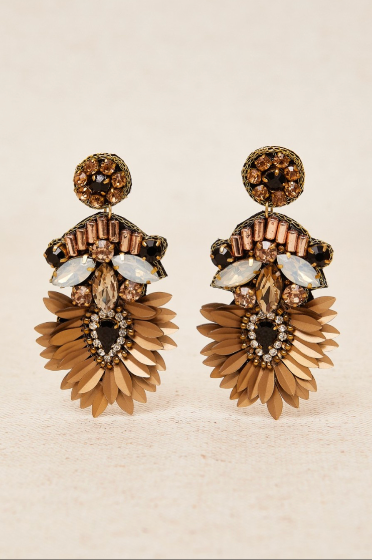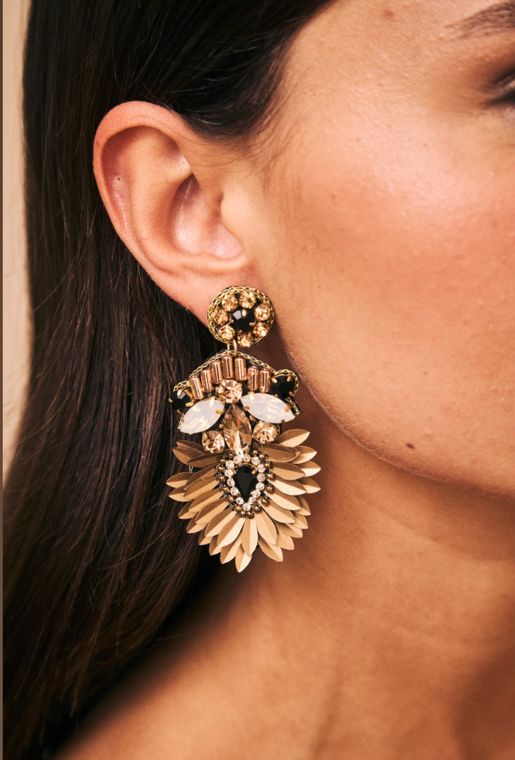 Con un original diseño, estos pendientes en tonos dorados han sido elaborados con diferentes resinas y cristales, aportando un efecto texturizado único. Su parte trasera está rematada en ecopiel para aportar ligereza. Una pieza boho chic que redefine la elegancia moderna.