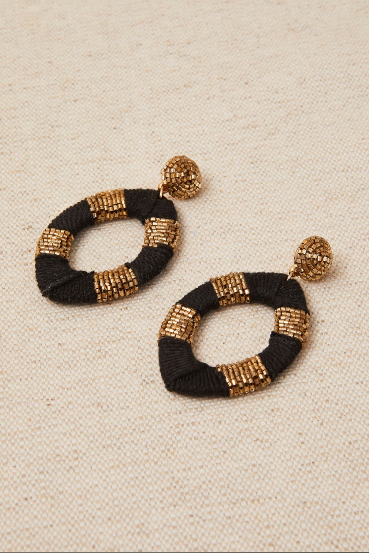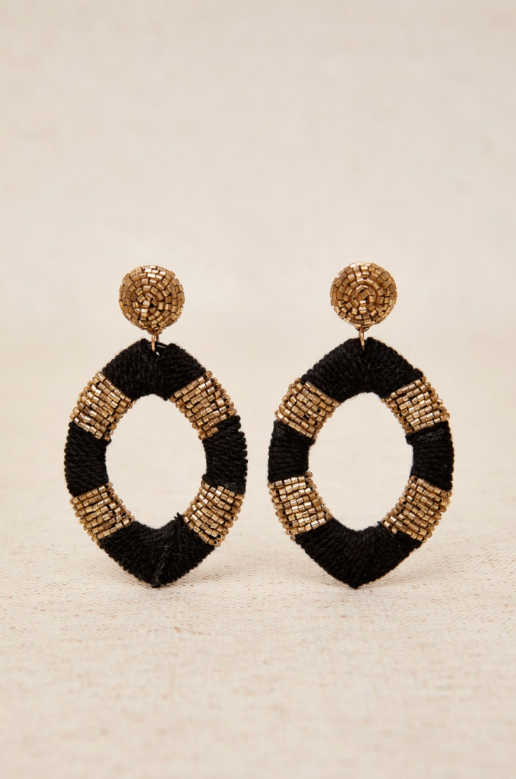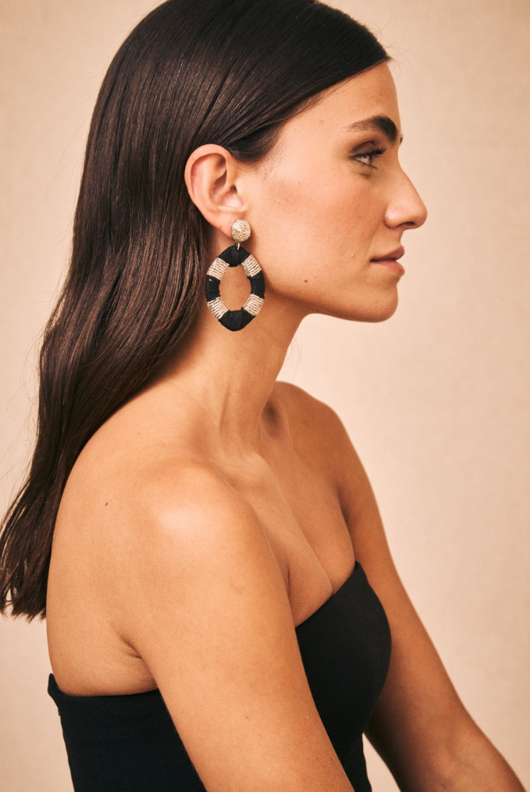 El brillo destaca en estos pendientes combinados con hilo negro y con forma ovalada, lo que además hace que sean muy ligeros. Con un toque boho, sus hilos y la borla superior en tonos brillantes hacen que sean un accesorio ideal para lucir en ocasiones más especiales.