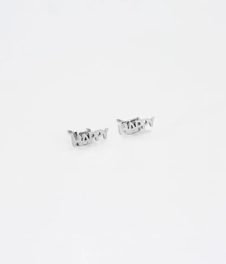 Mini pendientes de botón de acero liso o bañados en oro fino que presentan la palabra "happy".