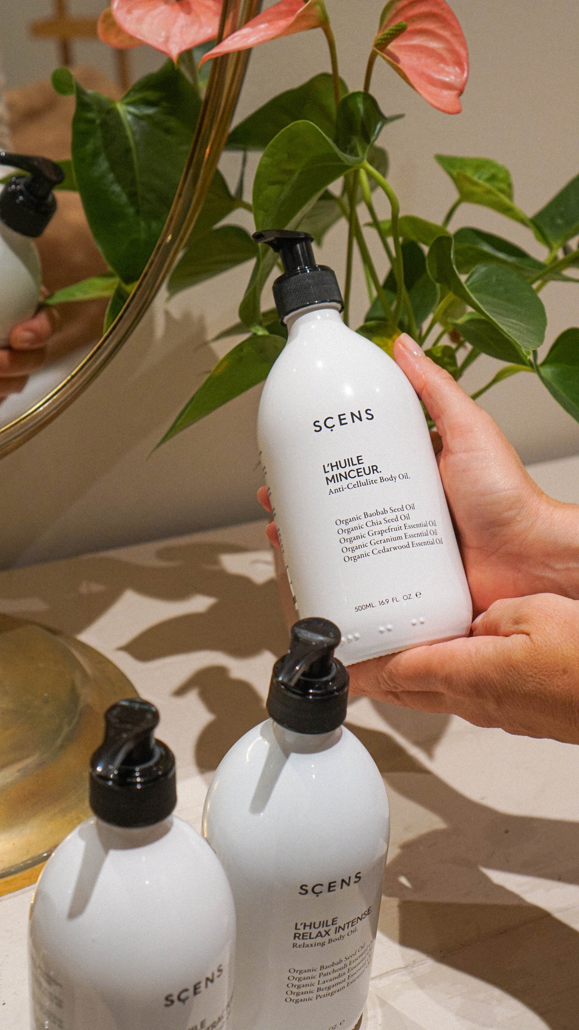 MINCEUR: Un tacto único para mejorar la textura de la piel. Materias primas de acción anti-celulítica (pomelo), drenante (geranio y cedro) e hidratante (baobab y xia orgánica).