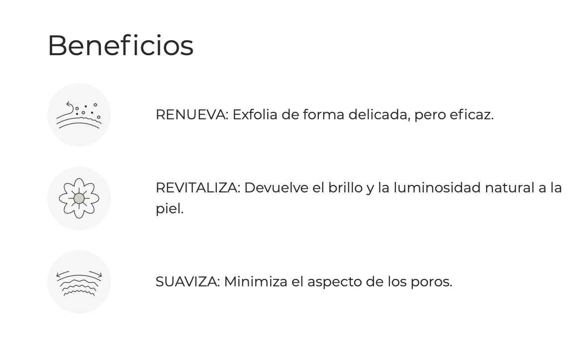 Gracias a su suave pero eficaz fórmula, que contiene semillas de rosa mosqueta y extracto de naranjas amargas rico en alfa-hidroxiácidos (AHAs), exfolia la superficie de la epidermis para renovarla y minimizar visiblemente manchas oscuras y poros.
