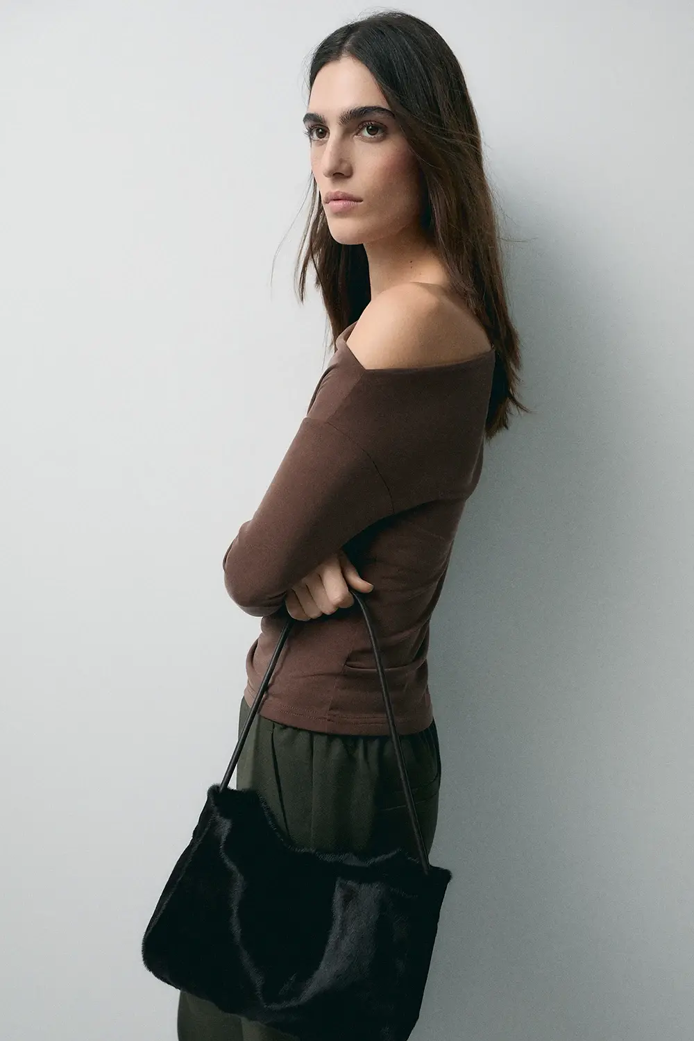 Camiseta con escote asimétrico. Manga larga. Calidad del tejido tipo cupro. Fitting ajustado