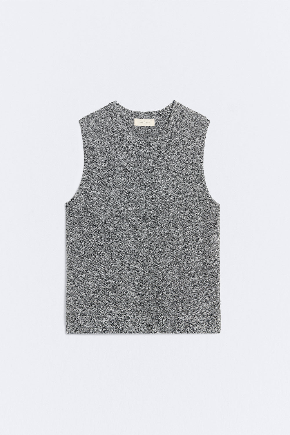 Chaleco de tirantes bicolor. Cuello caja entallado. Costura con puntadas pequeñas y agrupadas, tipo rice. Efecto jaspeado. Abertura cadera.