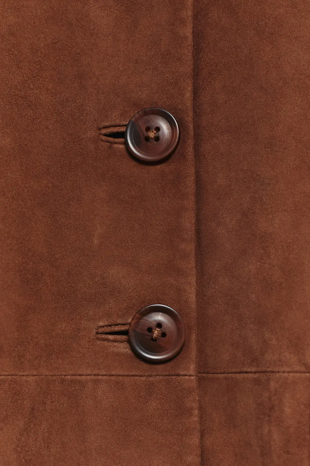 Chaqueta 100% piel serraje. Cuello chimenea. Manga larga. Dos bolsillos cartera. Cierre abotonadura. Forro en satén de poliéster. Certificación Gold LWG. Fitting recto. Funda protectora incluida. Largo prenda para talla S: 54 cm