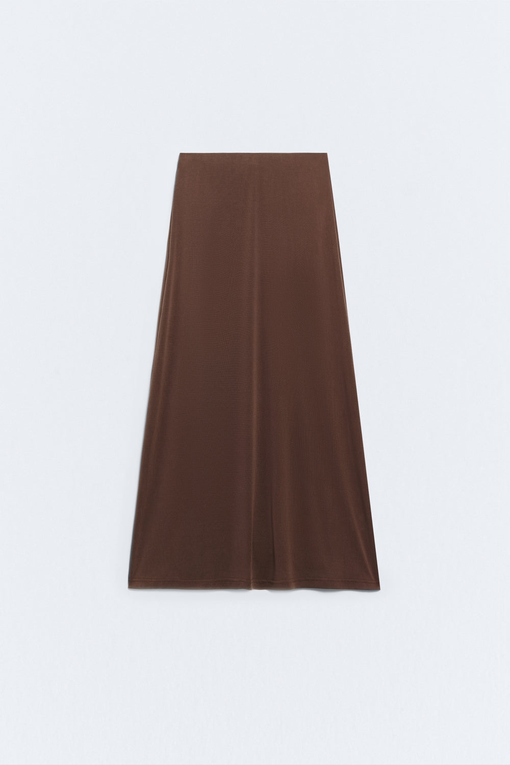 Falda larga fluida. Cinturilla con goma interior. Tejido elástico. Sin cierre. Calidad del tejido tipo cupro.