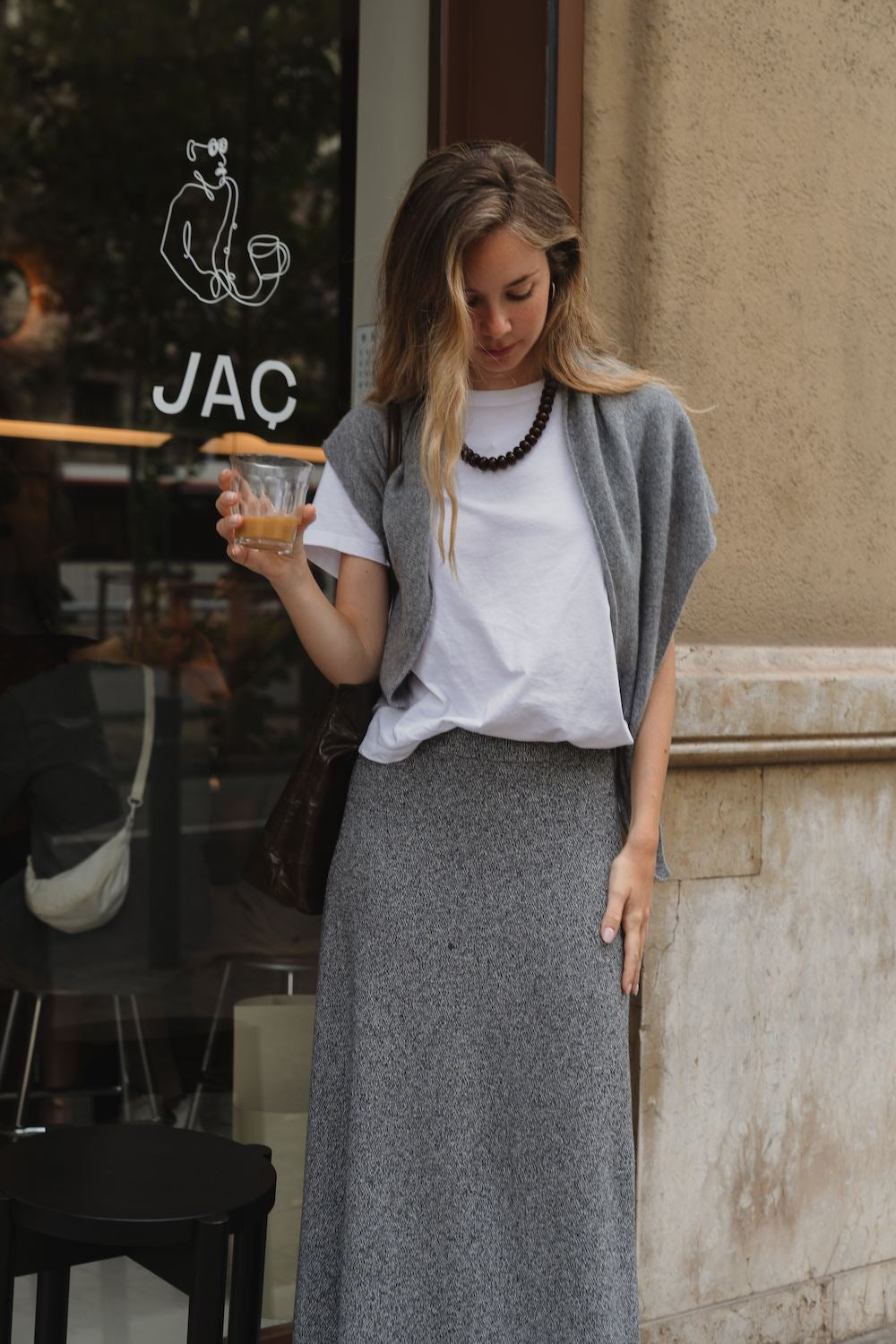 Falda midi evasé bicolor. Costura con puntadas pequeñas y agrupadas, tipo rice. Efecto jaspeado. Goma en la cintura. Tejido elástico. Sin cierre.