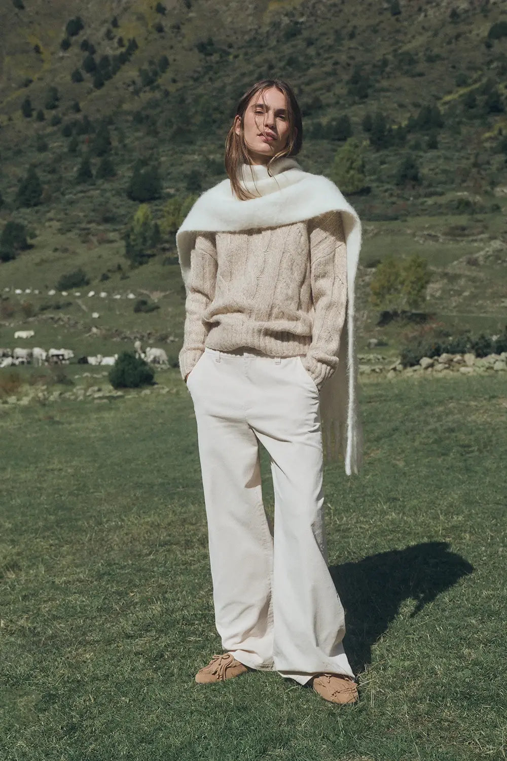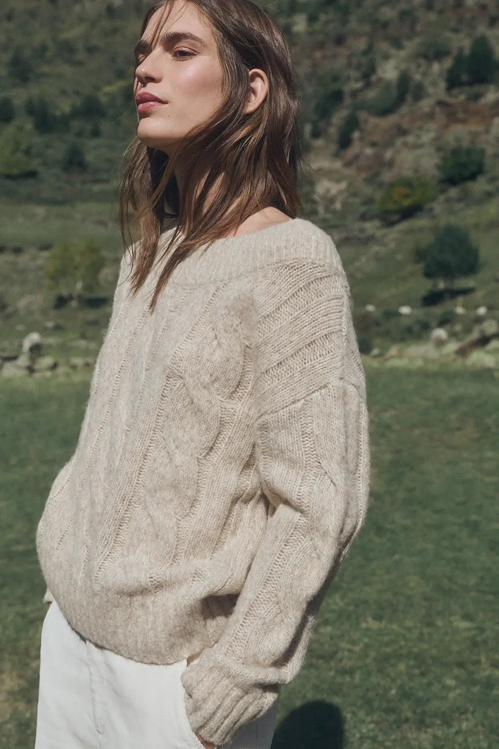 Jersey de punto grueso (galga 5). Con composición de lana. Estructura del tejido en ochos. Cuello asimétrico. En color avena. Largo prenda para talla S: 55 cm.