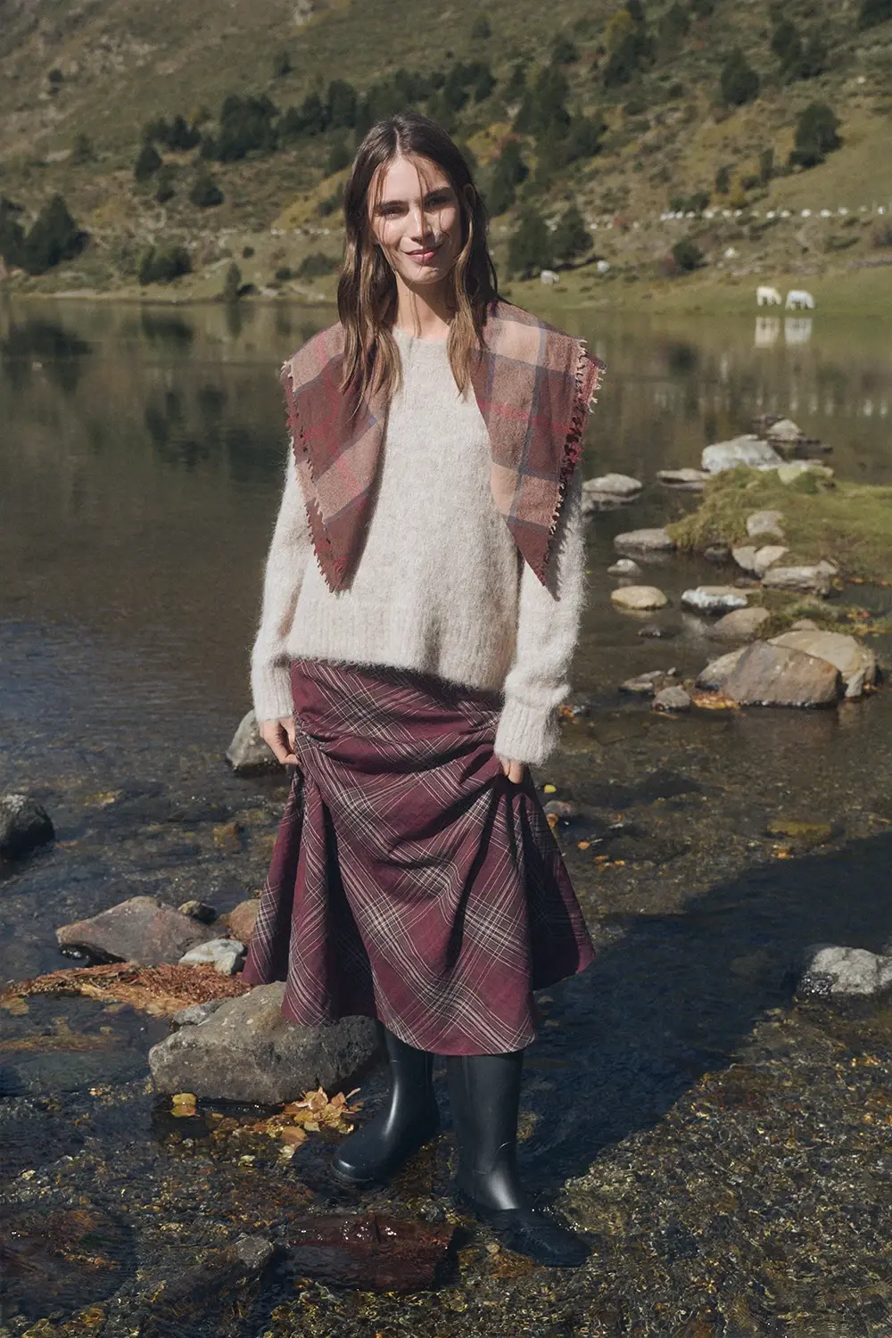 Jersey de punto con composición de lana de alpaca efecto peinado. Tejido de grosor medio. Escote tipo caja. En color taupe.