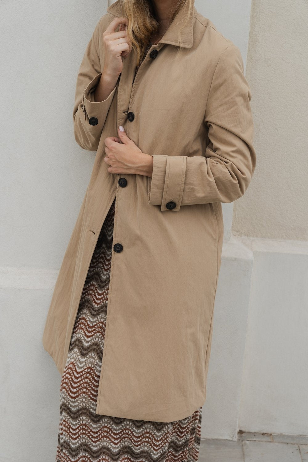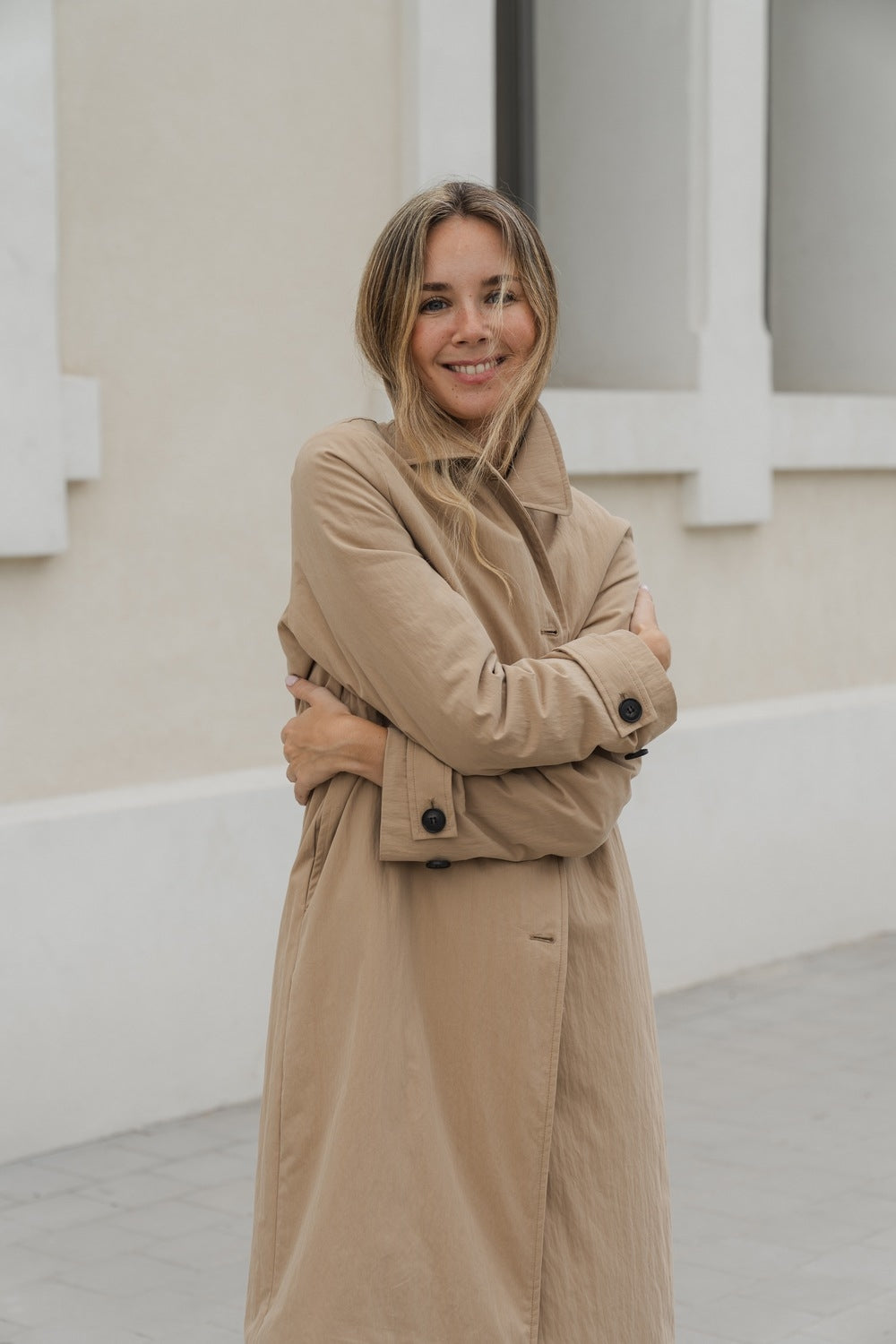 Trench acolchada de abotonadura simple. Hecha de algodón y nylon reciclado. Relleno de poliéster reciclado. Laminado DWR grado 4, resistente a la lluvia y la nieve. Lavado tintorería recomendado